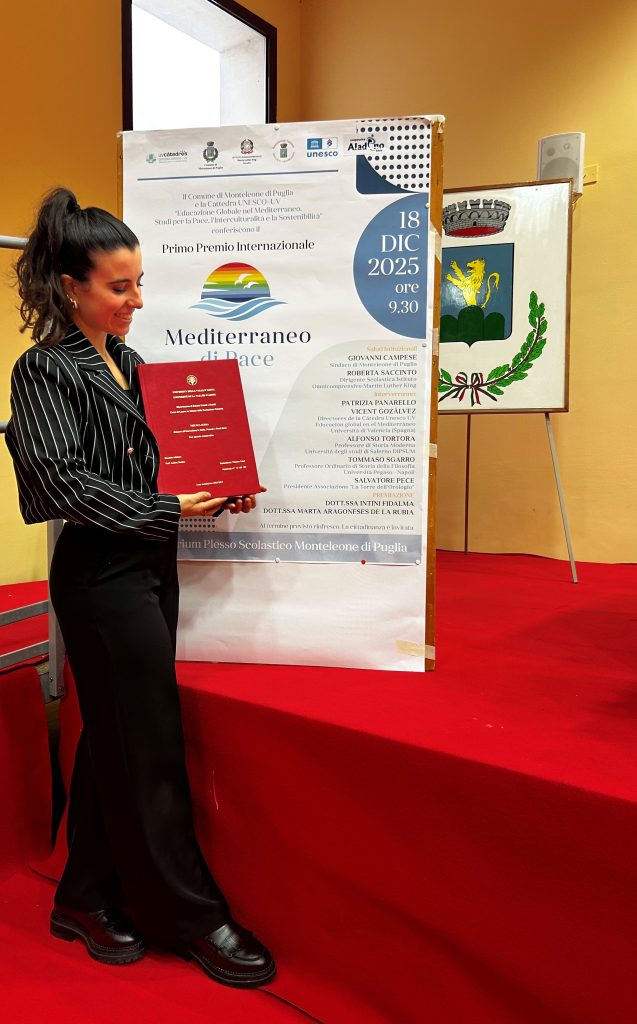 Il Premio Internazionale Biennale “Mediterraneo di Pace”, alla sua prima edizione, è un’iniziativa culturale ed educativa promossa dal Comune di Monteleone di Puglia in collaborazione con la Cattedra UNESCO–UV (Università di Valencia) “Educazione Globale nel Mediterraneo. Studi per la Pace, l’Interculturalità e la Sostenibilità”. L’obiettivo del Premio, che si inserisce nelle iniziative per la promozione della pace e della non violenza nel pieno rispetto dei principi della Dichiarazione Universale dei Diritti Umani, è quello di valorizzare studi e ricerche capaci di contribuire in modo concreto alla diffusione di una cultura della pace, attraverso l’educazione, la formazione e la riflessione critica sulle politiche educative e sociali nell’area del mediterraneo.